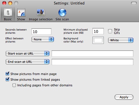 Once you've specified a good starting place for a Web show, you can further control content by telling Envision where to look for (scan for) images, and when to re-scan. The settings options, described below, are