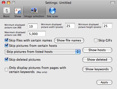 Once you've told Envision where to look for images, you can also specify what types of images to download and display. Doing so not only limits the show to images you want to see, it can also speed up the show by having Envision not download images unnecessarily. The following settings are found in the Image selection pane of the Settings dialog, shown below in Figure 4. Note that some controls are marked "Mac only" -- this indicates that these controls affect the the display of the show in Envision on the Macintosh, but not in iEnvision on the iPhone or iPod touch. For details, see Authoring for iEnvision