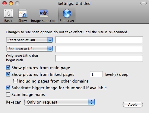 Re-scan - Tells Envision when to re-scan a site. Re-scanning means reloading the page at the initial URL and going through the entire process of looking for images. This is necessary for changes to certain settings, and may be desirable for sites that change their visual content frequently. Choose the desired value from the popup menu.